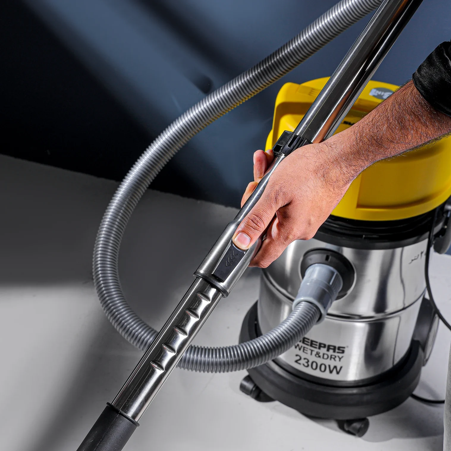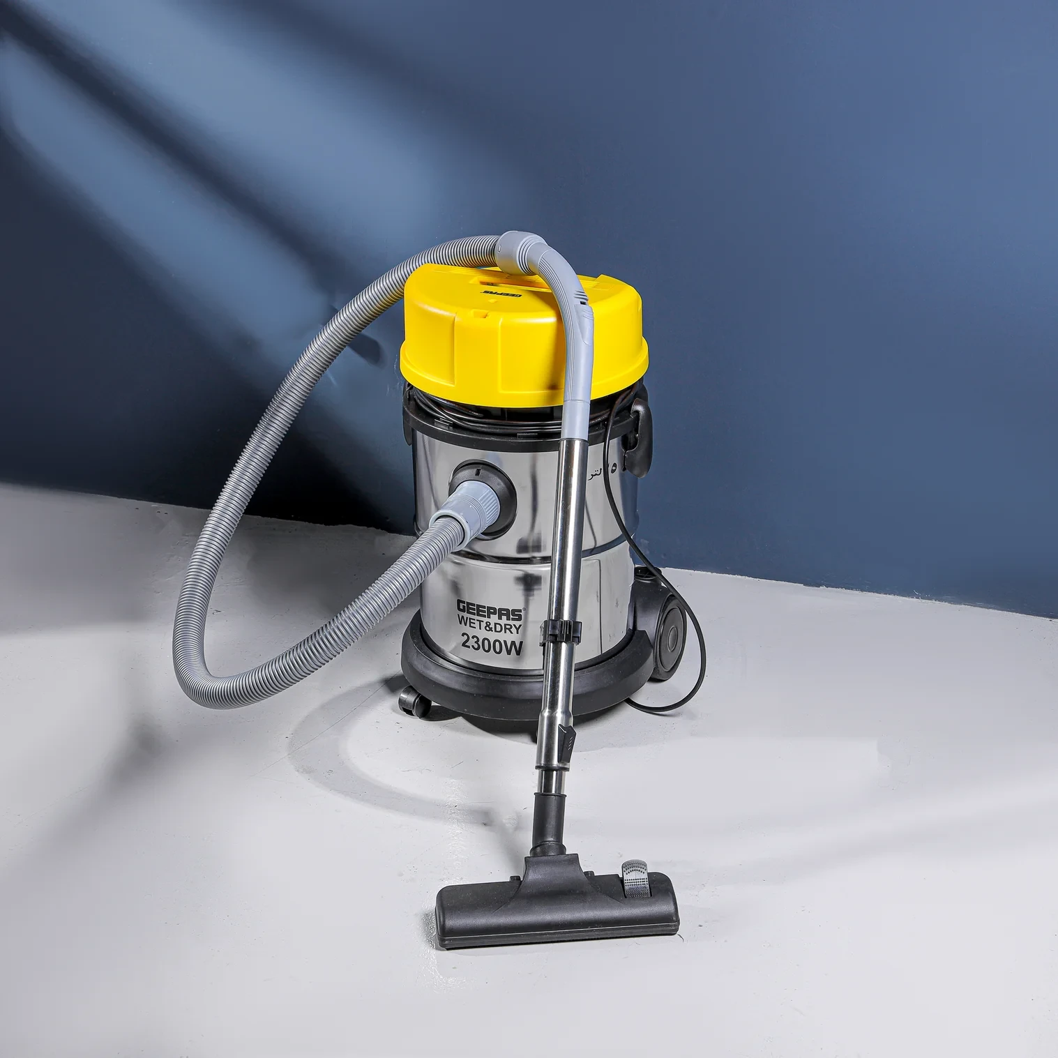 Innovative design to achieve a thoroughly cleaned surface. You can simply get clean, immaculate floors and corners with the newly designed Geepas wet and dry vacuum cleaner. This vacuum cleaner is designed and manufactured from the finest quality materials with an anti-rust body and a powerful 2300 W copper motor, making it highly resistant to corrosion, highly durable, and long-lasting. The compact, modern, and stylish design adds to the look of the vacuum cleaner. The lightweight design with wheels makes it easy to carry around the house. With a high-performance 2300-watt motor, powerful suction, and multiple useful functions, this appliance provides spotless cleaning in no time. The vacuum cleaner has a wet and dry function, is ideal for cleaning tiled floors, carpets, walls, and other difficult-to-reach areas, and provides quick and effortless cleaning. The vacuum cleaner is equipped with a stunning and durable stainless steel tank that is resistant to rust, corrosion, and bacteria, ensuring a hygienic environment for collecting and storing dust. The vacuum cleaner also features an extra-large dust bag with a capacity of 25 liters that you can use for a longer period of time. The wheels allow you to move around freely when cleaning. It has a powerful adjustable suction feature on the handle that effectively removes deeply embedded dust and dirt from furniture, hair, cereal, paper bits, and other particles from other surfaces. Its stylish yellow and silver color, innovative structure, and portable design make this vacuum cleaner an attractive choice for any home. The vacuum cleaner measures 38.5x34x65 cm, weighs 6.5 kg, and comes with a 2-year manufacturer's warranty.