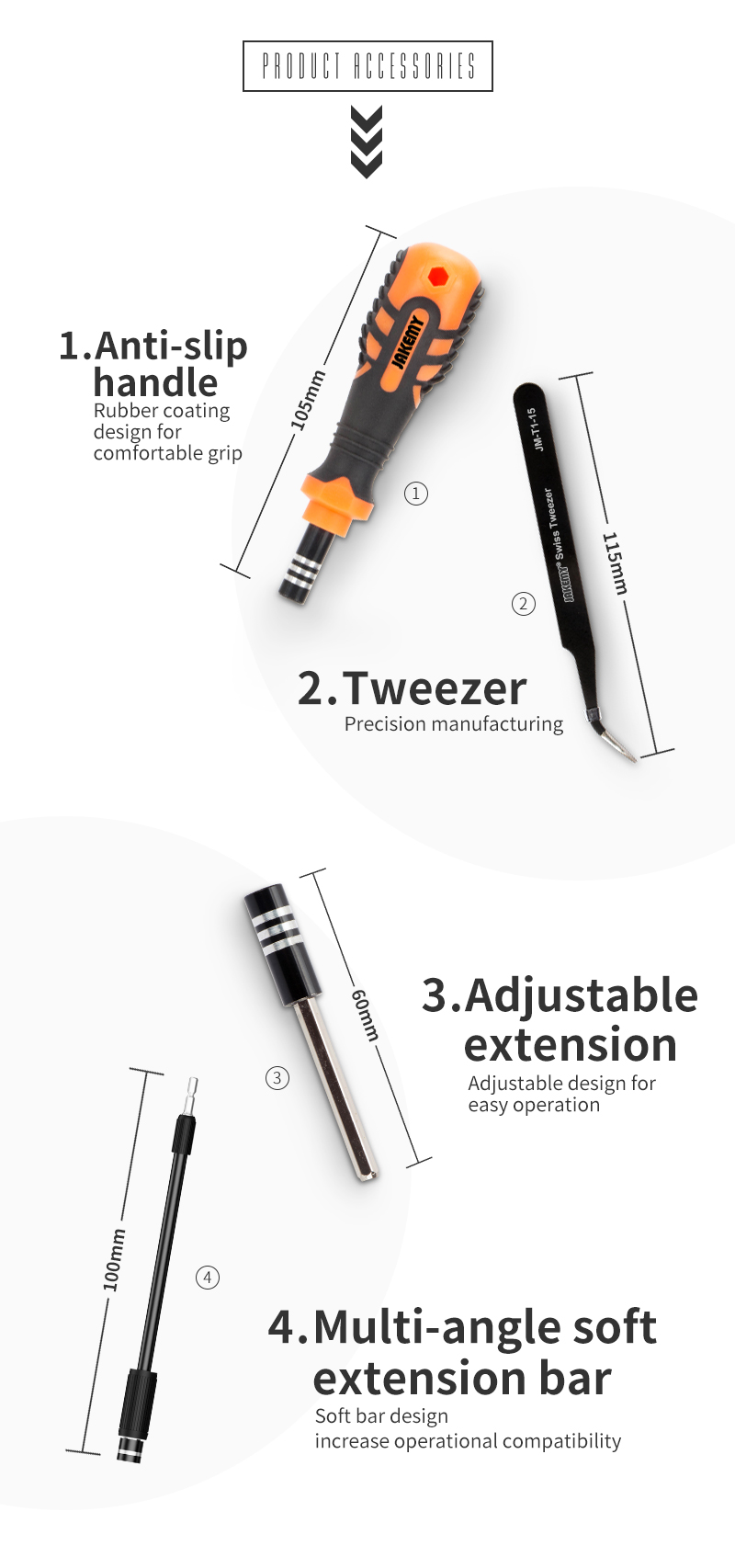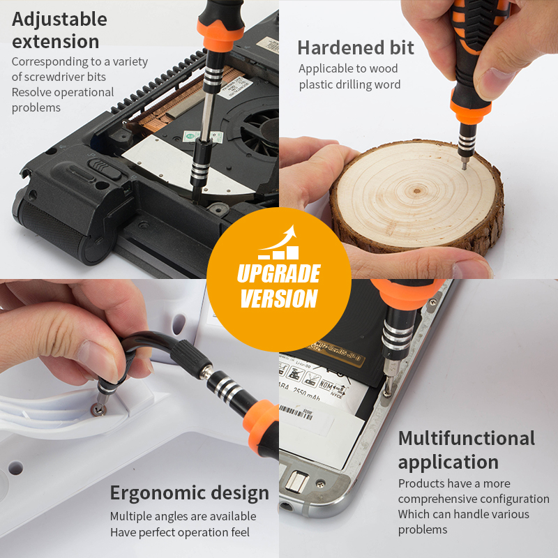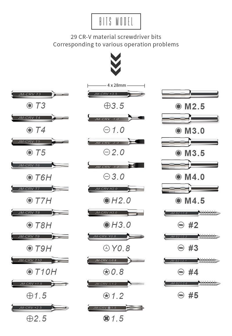 With Tweezer, Extension road, Anti – slip handle, Flexible extension bar and 29 different bits. The bits are made of chrome-vanadium (CR-V) steel, offer durability and corrosion-resistant performance. Non-slip rubber designed handle for better and convenient Handling. Common used in precision work in electronics, DIY models, jewelry, eye glasses and other home applications. Special pentalobe screwdrivers for iPhone, iPad and MacBook.